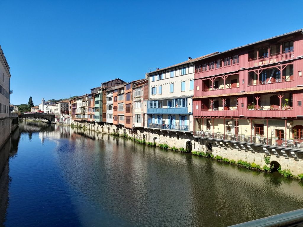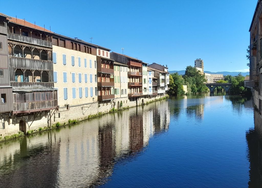 Redescendant de la Montagne Noire, nous avons retrouvé des chaleurs caniculaires qui nous ont fait traverser un peu rapidement Castres (malheureusement célébre en ce moment du fait de la très controversée autoroute Toulouse-Castres) qui offre pourtant quelques belles rues et monuments anciens, ainsi que ces typiques maisons dominant l’Agout :