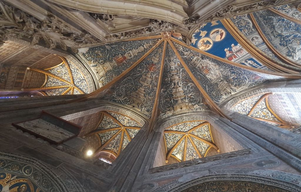 Flanquée de son massif palais épiscopal : la Berbie (qui abrite le musée Toulouse-Lautec), la cathédrale est son monument phare alliant, dans un contraste saisissant, sévérité de forteresse et esthétique minimaliste, à l’extérieur, à une exubérance décorative des sculptures du chœur et des peintures (murs et plafonds), à l’intérieur :