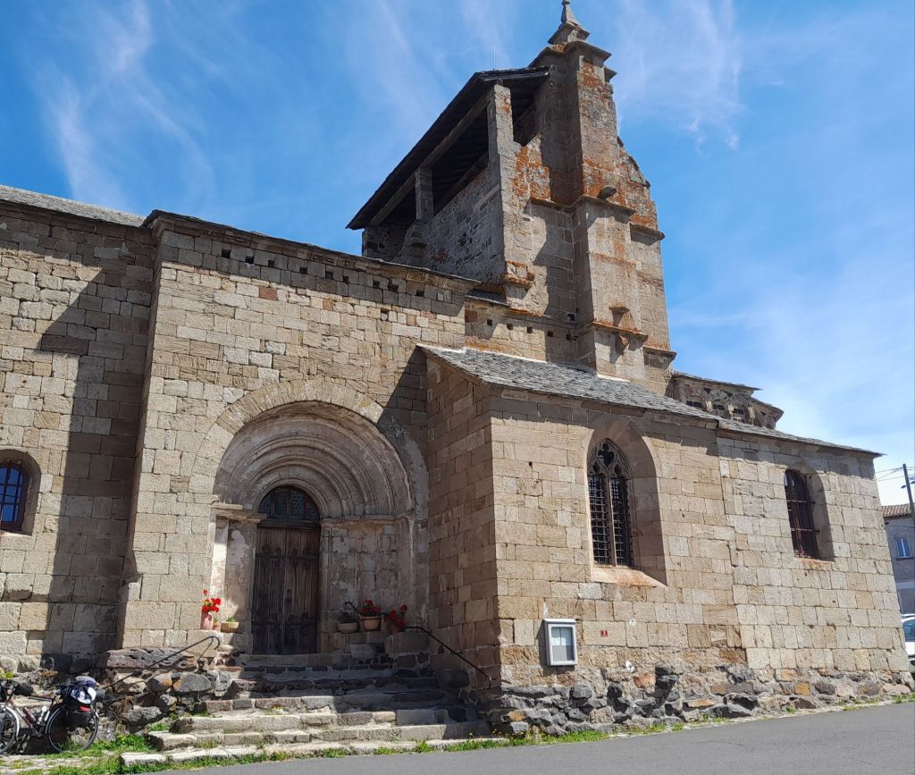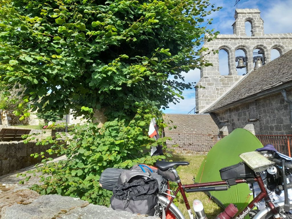 En Margeride, le matériau est le granit, comme en témoigne le clocher en peigne de l’église de St-Denis en Margeride au pied de laquelle j’ai été amené à planter ma petite tente verte, sur une pelouse municipale au plein milieu du village.  A près de 1200 m, la nuit était fraîche, ainsi que l’eau (délicieuse) de la fontaine voisine.