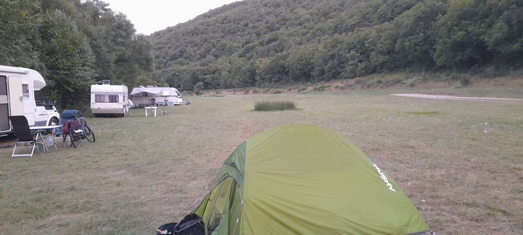 Faute de temps, et d’énergie, j’ai shunté l’Aveyron de toute sa longueur en train, d’Aumont-Aubrac à Montpaon (en passant, sous le viaduc de Millau). Sur cette troisième ligne tortillarde du sud du Massif Central, la gare de Montpaon, à l’extrême limite sud de l’Aveyron, doit son nom à un hameau de quinze maisons et ne dessert que des vallons perdus au fond de forêts déjà méditerranéennes, comme celui où je plante ma tente deux nuits