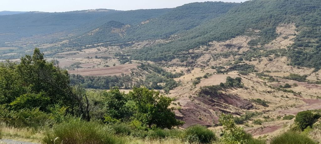 Un peu sud de Lodève, on pénètrent ensuite dans un immense rougier : bancs de roche brun-rouge  friable qui s’accumule en nappes de gravillons très ravinées :
