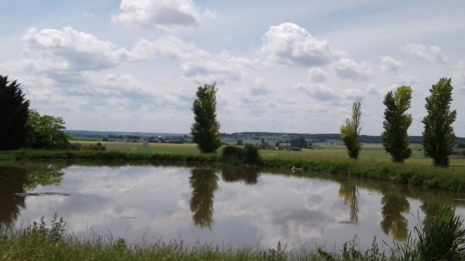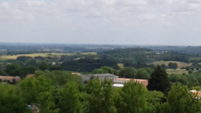 Puis, presque d’un seul coup, à Mauléon (Deus-Sèvres) je pénètre dans le bocage vendéen : le relief et le paysage changent complètement : en voici un aperçu depuis le village de St-Michel-Mont-Mercure (dont le nom est un double pléonasme ! puisque Mercure, comme St-Michel, sont des divinités tutélaires des points élèves) :