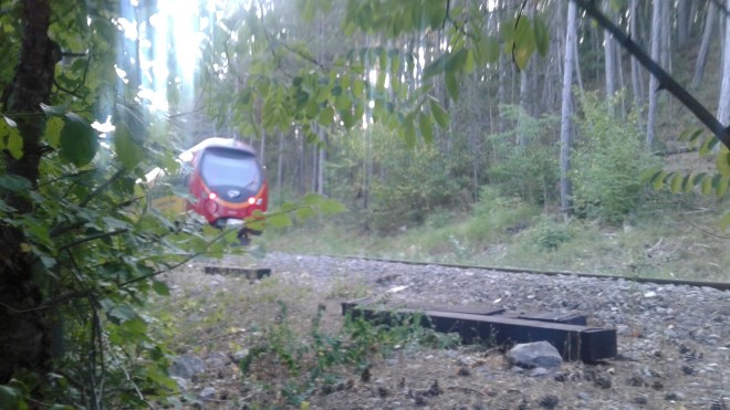 A Barrême, j’ai le plaisir de camper en bordure de « train des pignes » lignes à voie étroite qui relie, par les montagnes, Nice à Digne à une vitesse telle, disait-on, qu’elle laissait le temps de ramasser les pignons de pin en chemin. Une petite ligne perdue qui fait rêver…