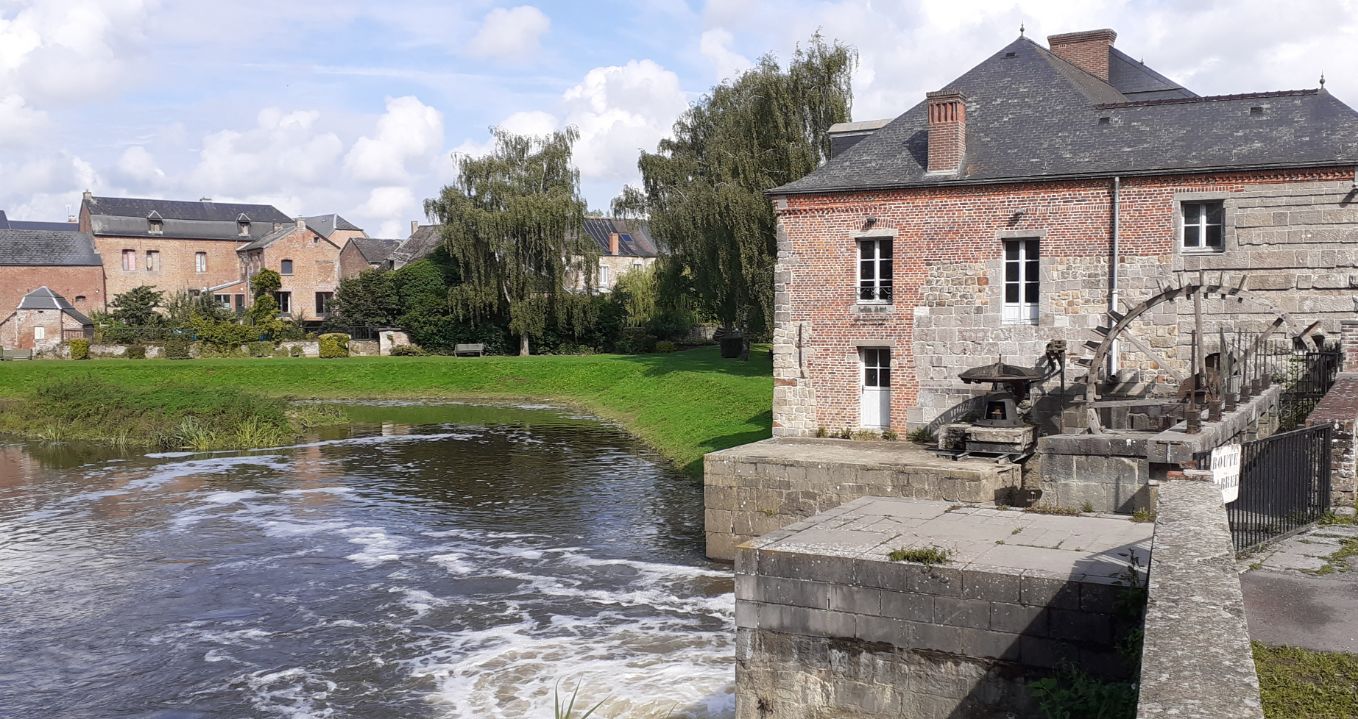 Un saut ferroviaire (encore un) me trasporte dans l’extrême sud-est du département du Nord, à Avesnes-sur-Helpe, petite sous-préfecture presque campagnarde. L’Avesnois est vraiment vallonné (on est aux confins des Ardennes) bocager, couvert de pâturages (qui fournissent le lait du Maroille), peu urbain et peu industriel : rien à voir avec le reste du 59, donc. De plus la brique du Nord se marie, ici, avec de la pierre, parfois beige parfois gris-bleuâtre (la plus chic) qui donne au bâti ordinaire, couvert d’ardoises, une certaine élégance